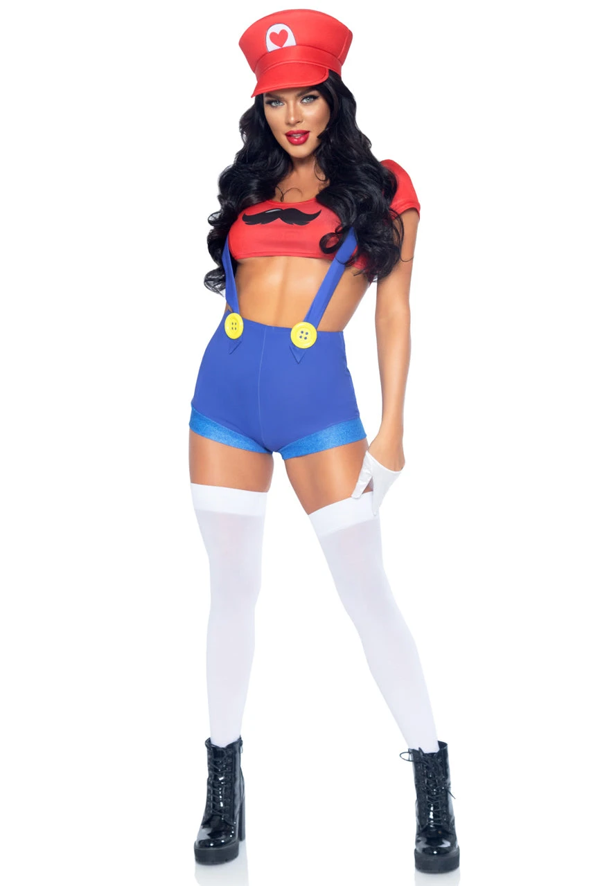 This three-piece, Gamer Babe costume includes a red crop top with mustache print, blue suspender shorts with yellow buttons, and hat. (Gloves and stockings not included.)