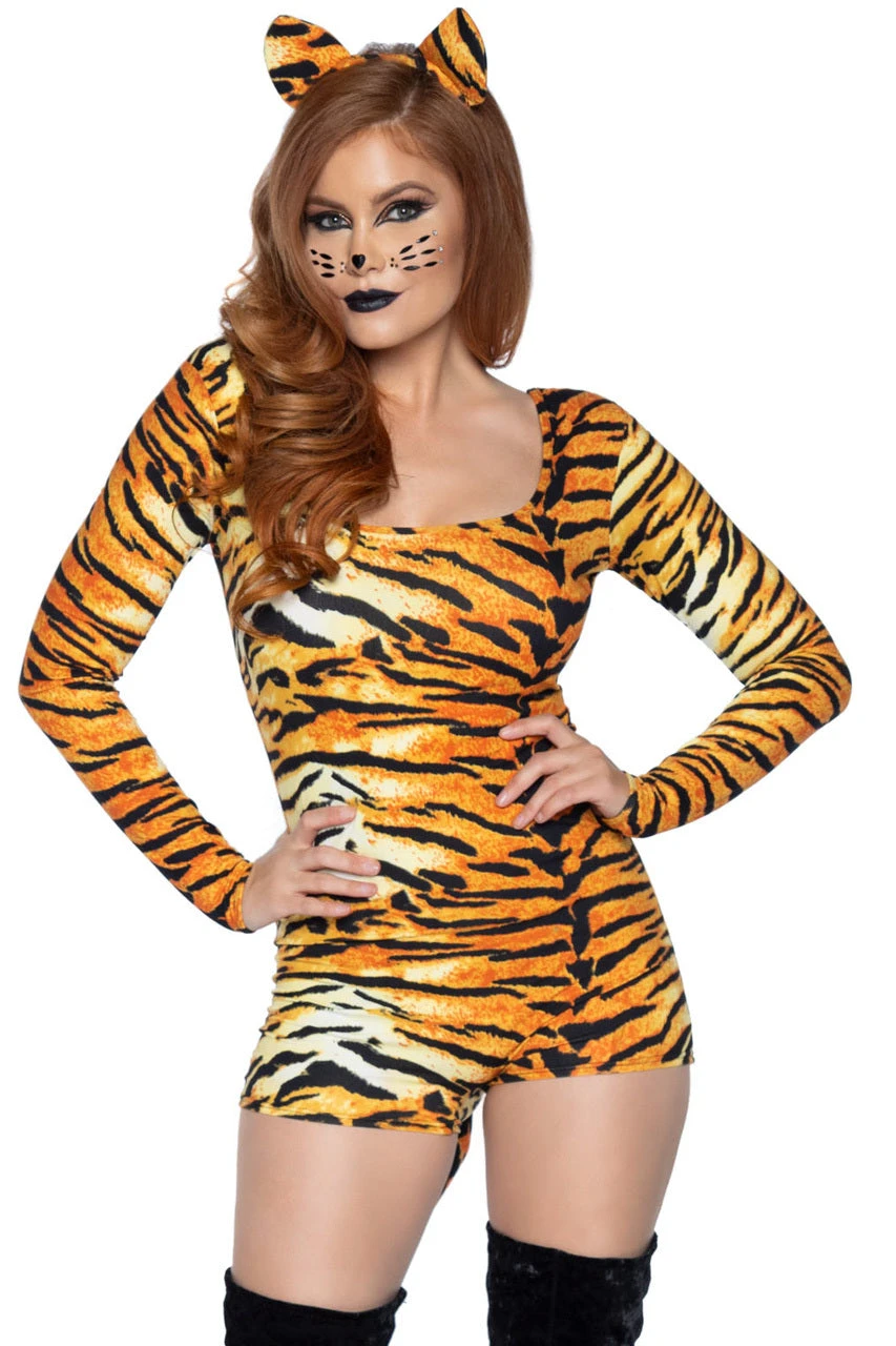 This two-piece, Untamed Tiger costume includes a tiger print romper with long sleeves, an attached tail and tiger ear headband.