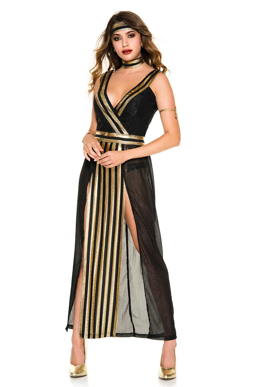 This three-piece Godly Empress costume includes a black and gold striped dress with sheer black side panels, high slit sides, a low cut bust, a matching headband a choker necklace.