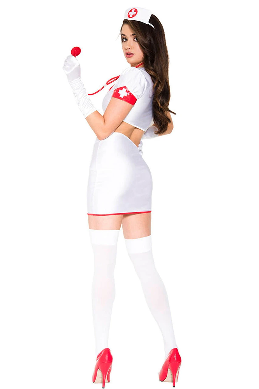 An angel both day and night, bring good feelings in this Night Shift Six Piece Nurse Costume! Features a 6 piece outfit with a white crop top with cross-print pockets, high waist skirt with attached cross apron, nurse headband, stethoscope, white gloves and matching thigh high stockings.