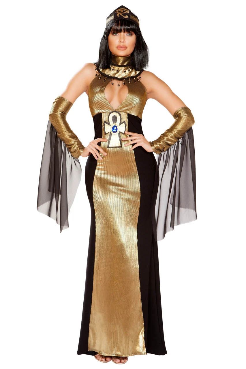 This four-piece, Ruler of Egypt costume includes a long gold gown with a keyhole cut out bust, cross detail, a beaded neckpiece, gold gloves with draping sleeves, and headpiece.
